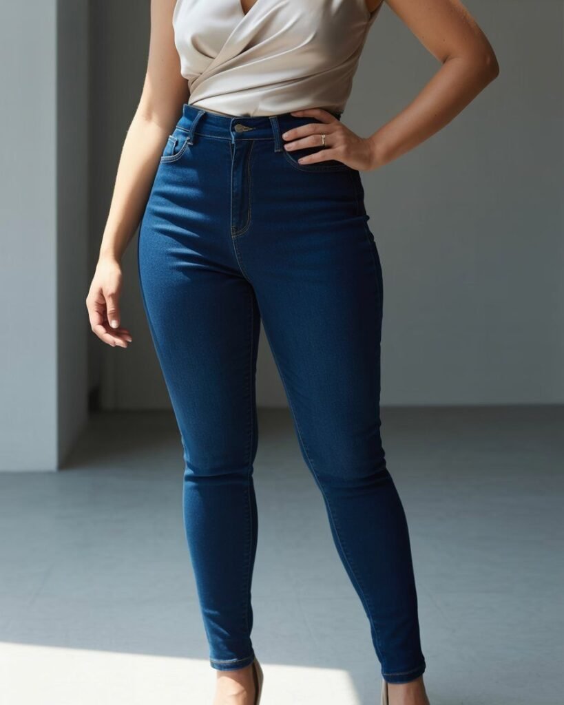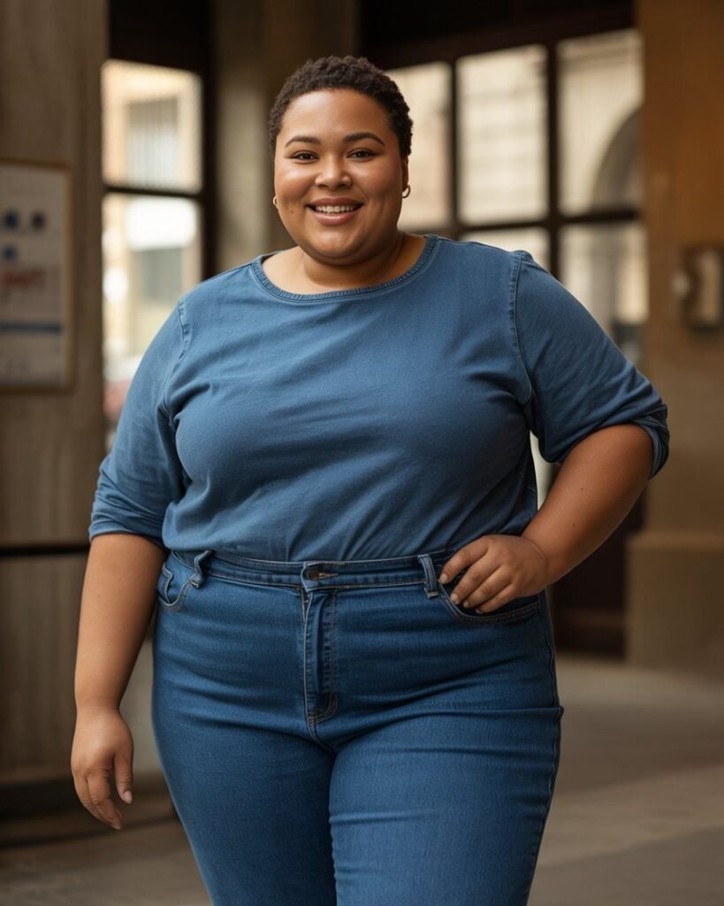 Stretch is your BFF here! Go for high-rise straight jeans or skinny jeans with stretch that hug your curves without digging in. Dark washes work magic in sculpting.